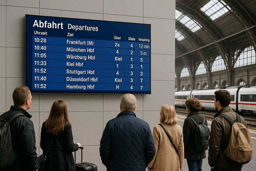 Digitale Fahrpläne und Abfahrtsanzeigen mit DSSHOW ermöglichen eine jederzeit aktuelle Darstellung von Echtzeitinformationen für Fahrgäste. Verspätungen, Linienänderungen und Umleitungen können dynamisch eingeblendet werden. Ideal für Bahnsteige, Haltestellen und Empfangshallen.